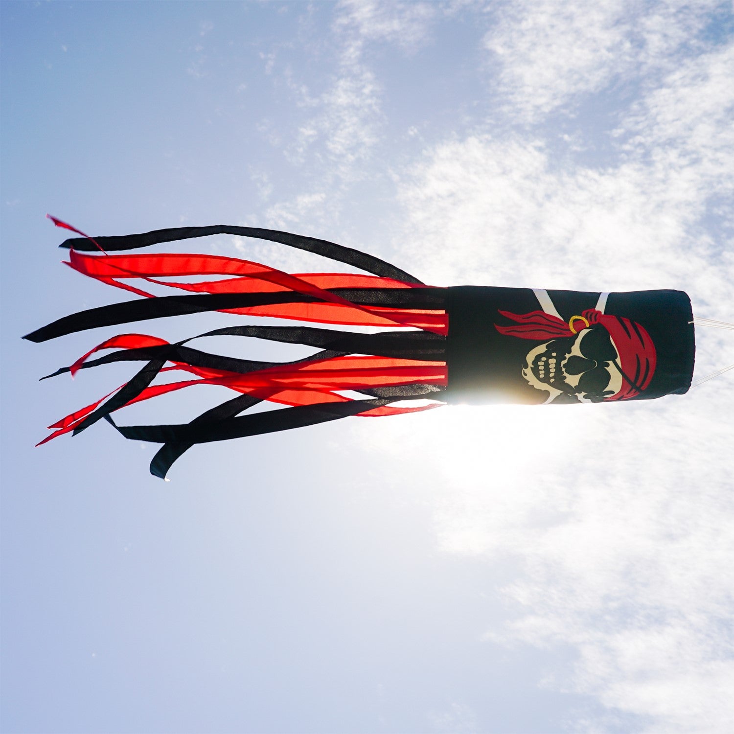 This I'm A Jolly Roger 40" Windsock features vibrant colors and detailed appliqued graphics complete with a headscarf, eye patch, and gold earring. The windsock's black and red color coordinating tails flutter whimsically in the breeze.